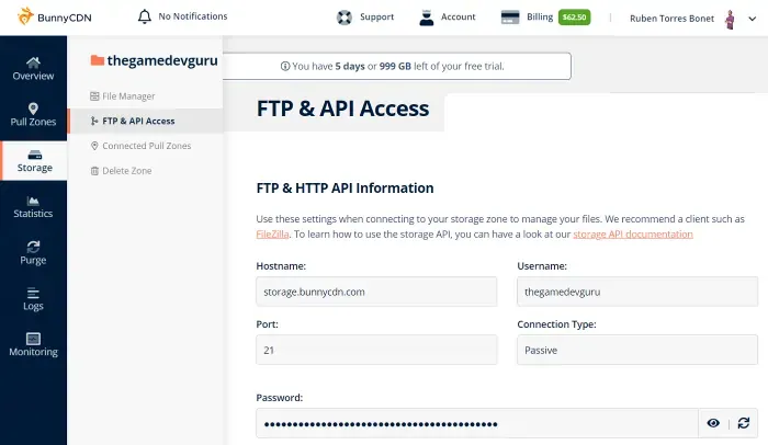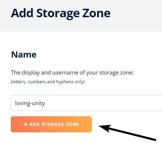 If you go to your storage zone, you’ll see a FTP section on the left menu. Clicking there will give you access to your hostname, username and password. Save these details in software like FileZilla.
