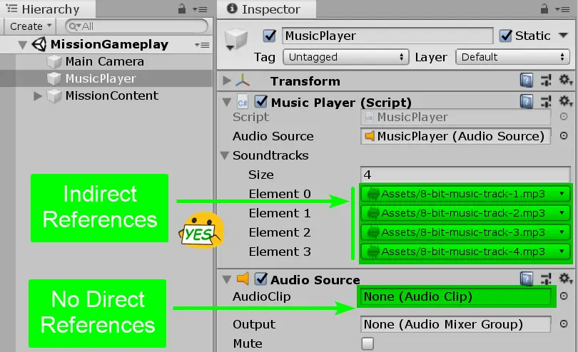 Coming back to our topic, you really don’t want to have too many direct references to different AudioClips at once. That would mean, they are all loaded in memory, even though we are potentially playing only one song.