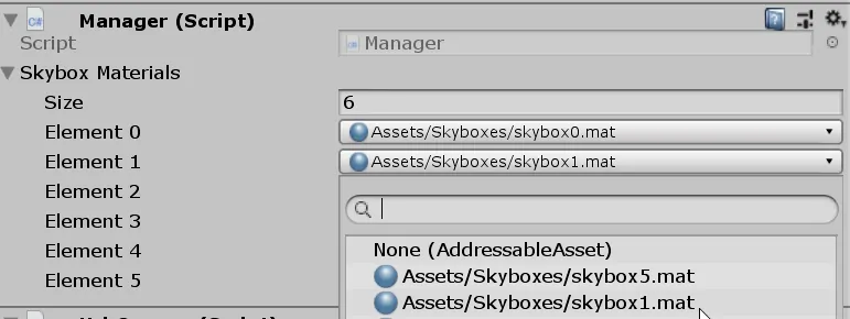 We are starting here with the simplest asset management method here. In our case, this entails having a list of direct references to skybox materials in our component.