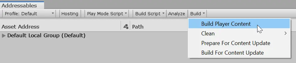 - In the addressables window, cook the content (build player content)
