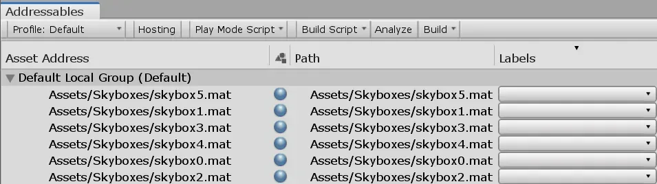 So far, so good. We applied the Unity addressables workflow to skyboxes, which was easy enough. The reason for its simplicity is that you only have a single skybox active at a time, so it is straight-forward to manage their life-cycle.