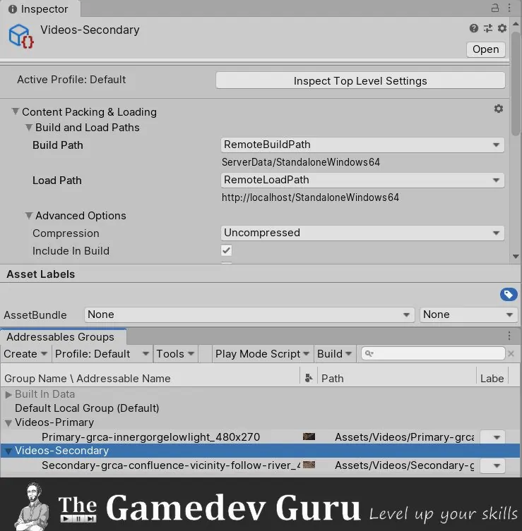 Here we’ll create Unity Addressable Groups: Videos-Primary and Videos-Secondary.