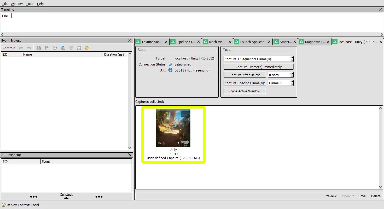 You can then double click the frame to load the frame into the RenderDoc frame analysis pipeline.