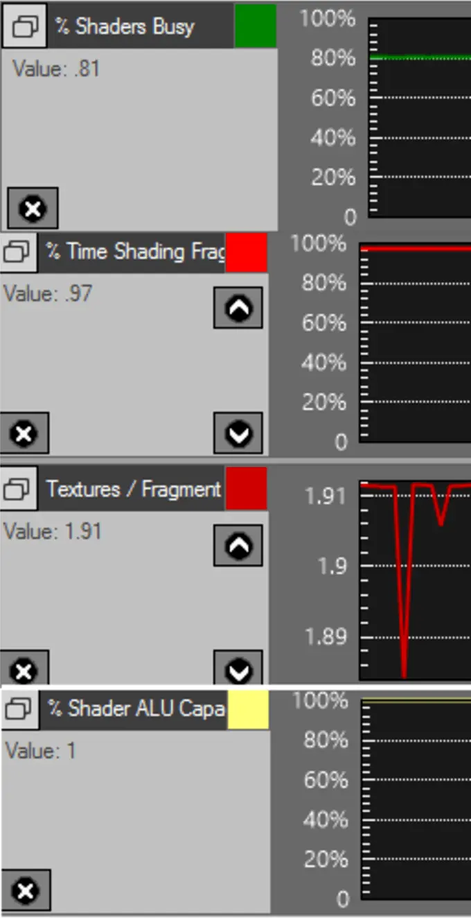 A more interesting graph is the Percentage Shaders Busy section which lies between 75 and 85 percent. That points to the probability of the GPU doing an excessive amount of expensive operations in the vertex or fragment shaders. Overdraw could be one reason for it; visible materials should be checked. In any case we see in other sections that we are spending lots of time doing fragment shading calculations with about 2 textures per fragment—albedo+normal— in average. My bet is that we are using the standard shader in too many places and that is overkill for mobile. Checking the % Shader ALU capacity confirms that we are doing too many operations that are not really dependant on accessing memory but rather on pure computational power.