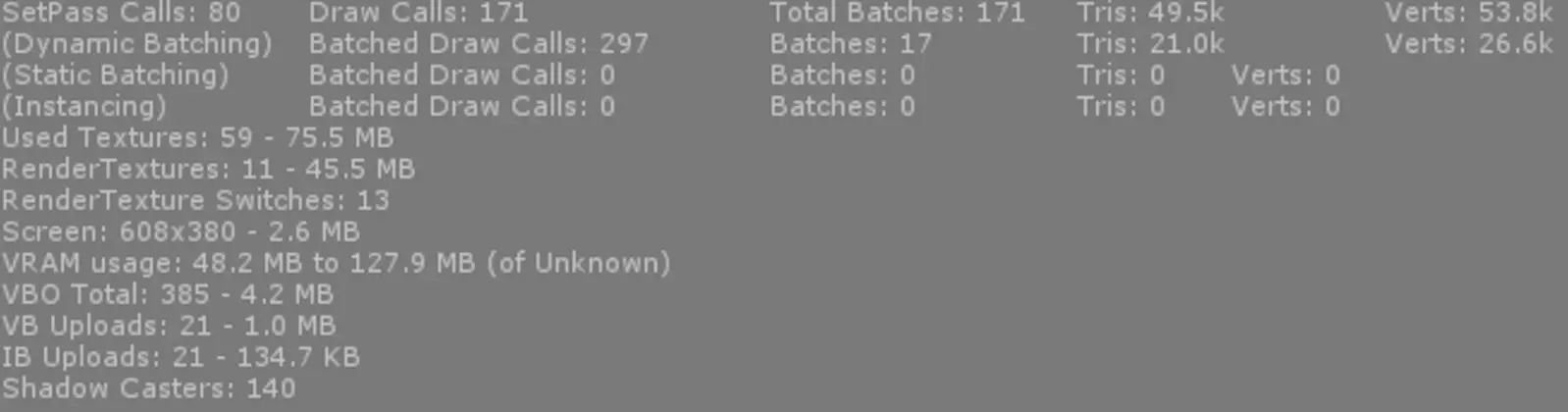 Approximately 50k triangles, 170 draw calls, 70mb textures, 45mb RT, 140 shadow casters. Not bad. Probably we have too many shadow casters and draw calls for mobile, but nothing too crazy. We might consider reducing the amount of draw calls but it might be a safer bet to find other real bottlenecks.