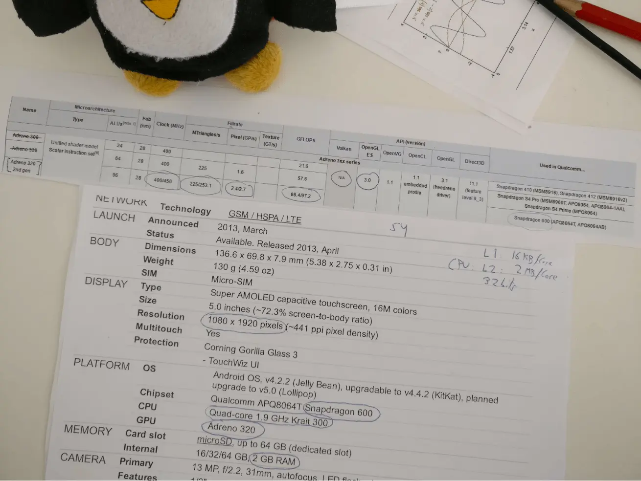 The next step that I took was to print the specification sheets to have them at hand all times so I could give it a quick glance whenever I had questions about the hardware behind it. That way I could relate specific issues I find in the software side with the hardware it runs on. For that I searched with the omnipresent duckduckgo search engine and was forwarded to sources such as GSMArena and Wikipedia where I got most of the information I needed about the hardware specs of the CPU, GPU, RAM, screen, etc.. Afterwards I got to print that information in a highly-skilled DIY style so I could leave it around my table at work while working on the project. For our Android reference device I found the following specifications most relevant: