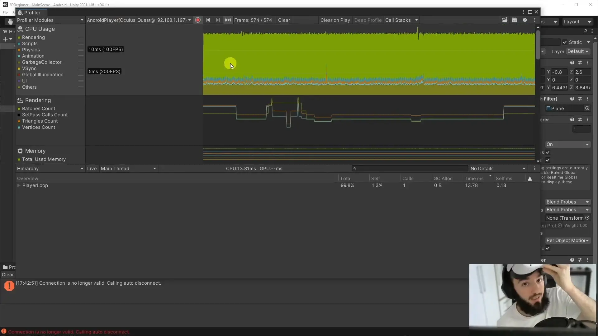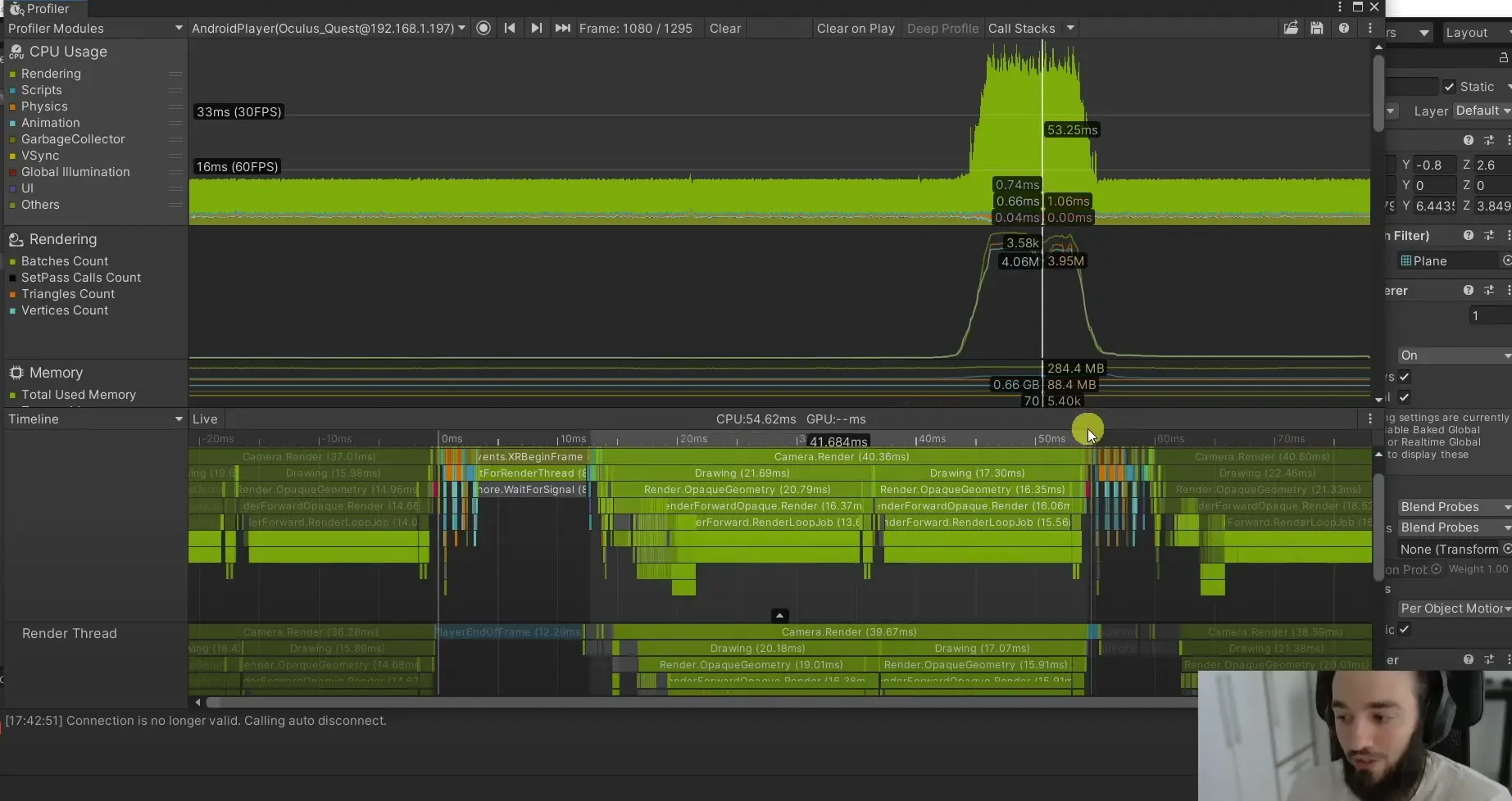 This number that you see here, 2000, is above our budget of 200 for Quest. This explains why if you go to the profiler, you will see that we are spending way too many milliseconds on the rendering section.