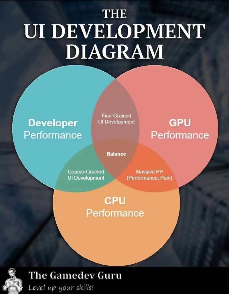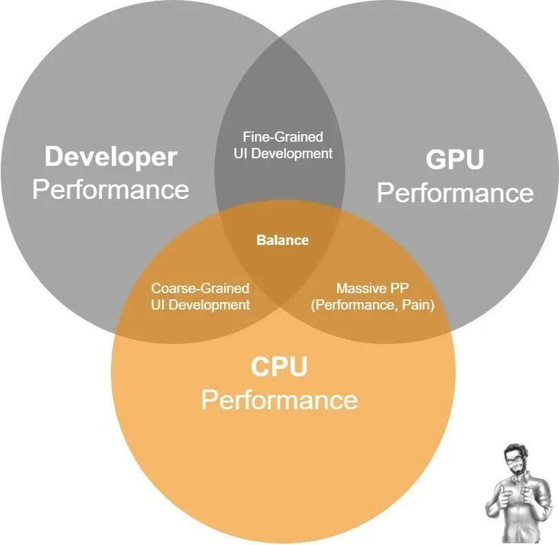 - The easier you want the UI design workflow to be, the less performant your UI will be.