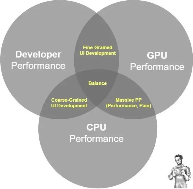 From the Venn Diagram you might see several sweet spots where you could find yourself in: fine-grained UI development, coarse-grained UI development, Massive PP and Balance.